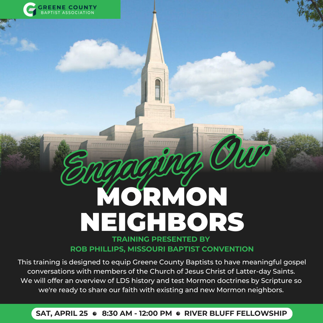 Engaging Our Mormon Neighbors is designed to equip Greene County Baptists to have meaningful gospel conversations with members of the Church of Jesus Christ of Latter-day Saints.